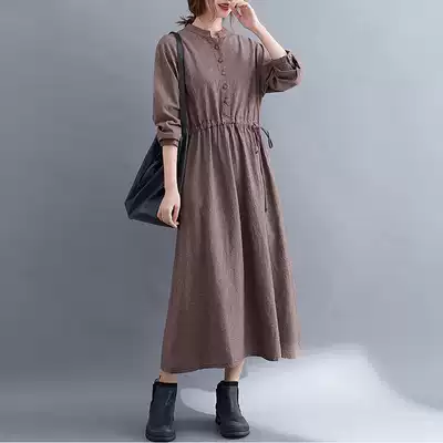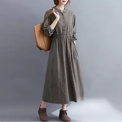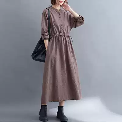 Mori retro linen lattice dress literary lace-up slim shirt skirt autumn dress bottom cotton linen dress long dress women
