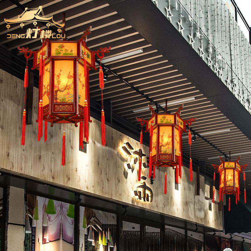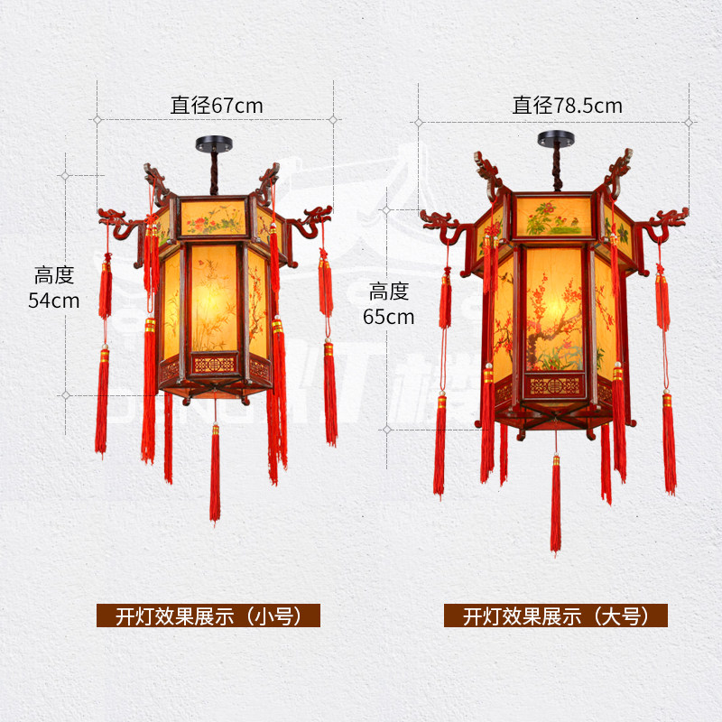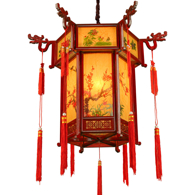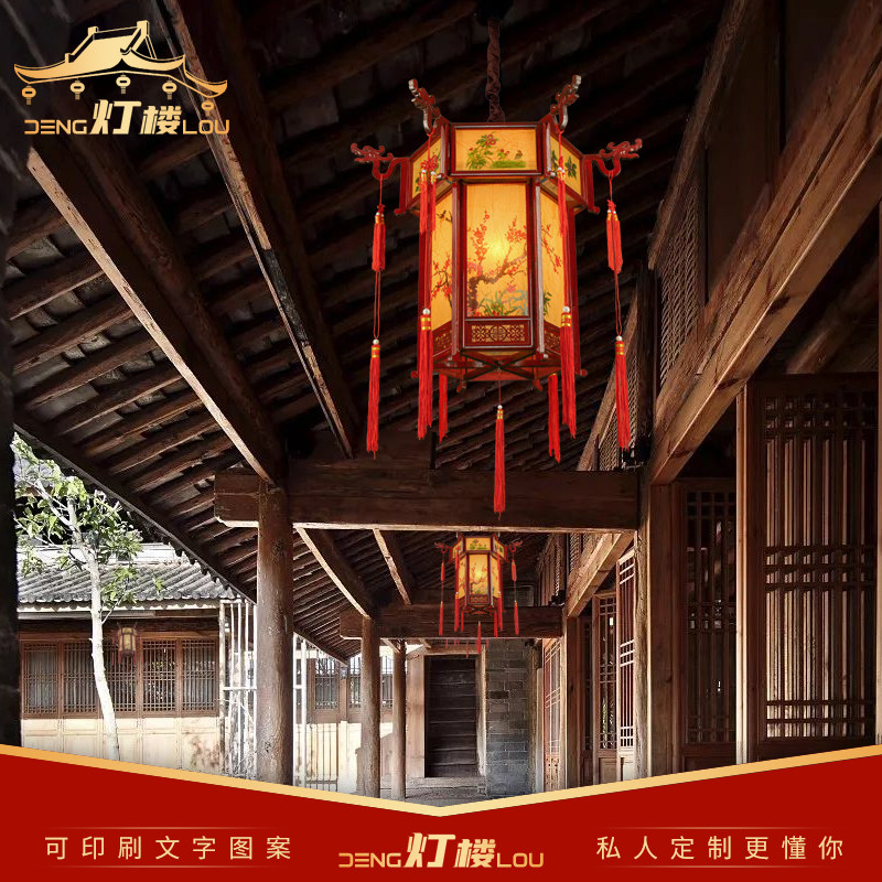 Chinese imitation antique hexagonal palace lamp solid wood lantern outdoor waterproof advertisement walking coal oil lamp tea building imitation sheep leather palace pendant lamp