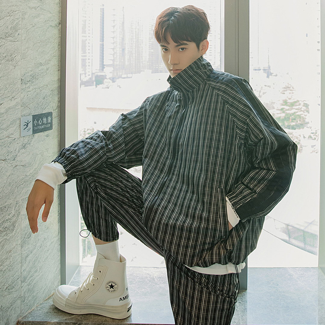 Sicilian men's spring stand-up collar jacket drawstring pants two-piece men's plaid casual sports suit Men's trend