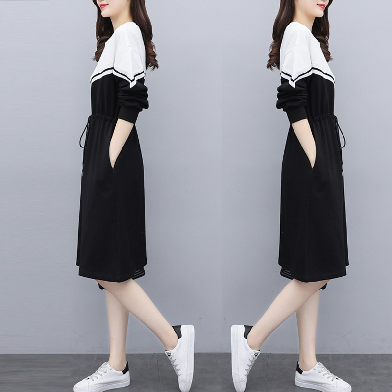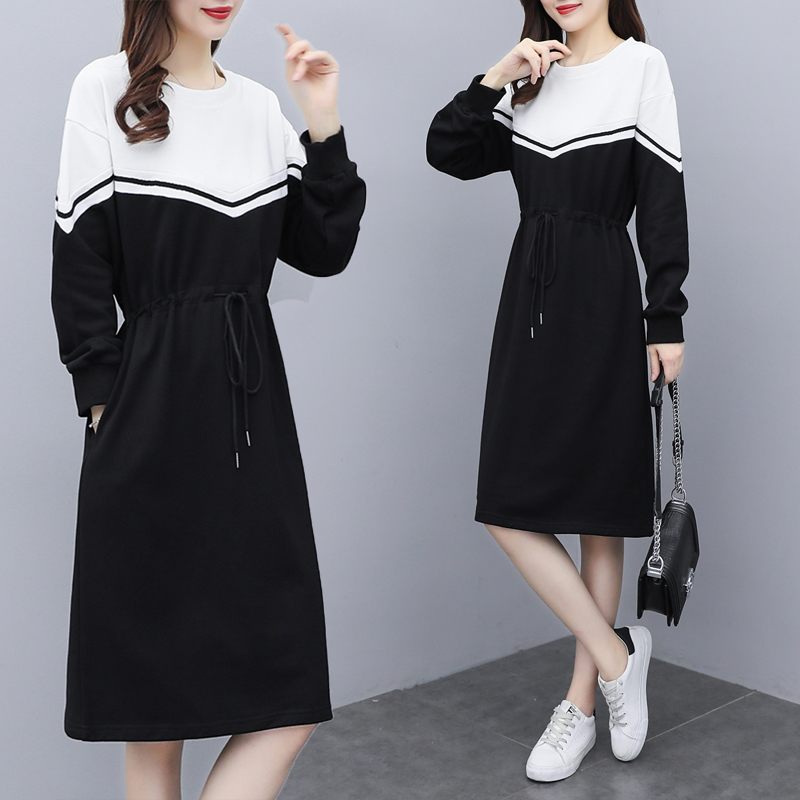 Black and white contrast color dress women's 2021 new spring and autumn fashion waist thin loose temperament casual thick cotton skirt
