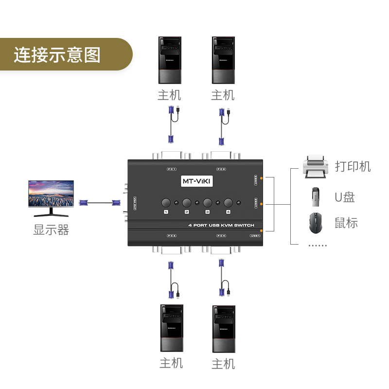 Maituovimoment KVM switcher 4-port USB high-definition VGA computer Key Mouse Co-shareware 4 in 1 out of MT-460KL