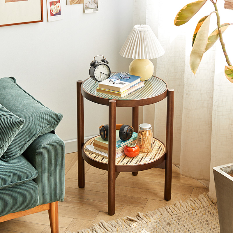 Nordic round glass coffee table solid wood rattan living room household tea table modern minimalist small apartment net red small table