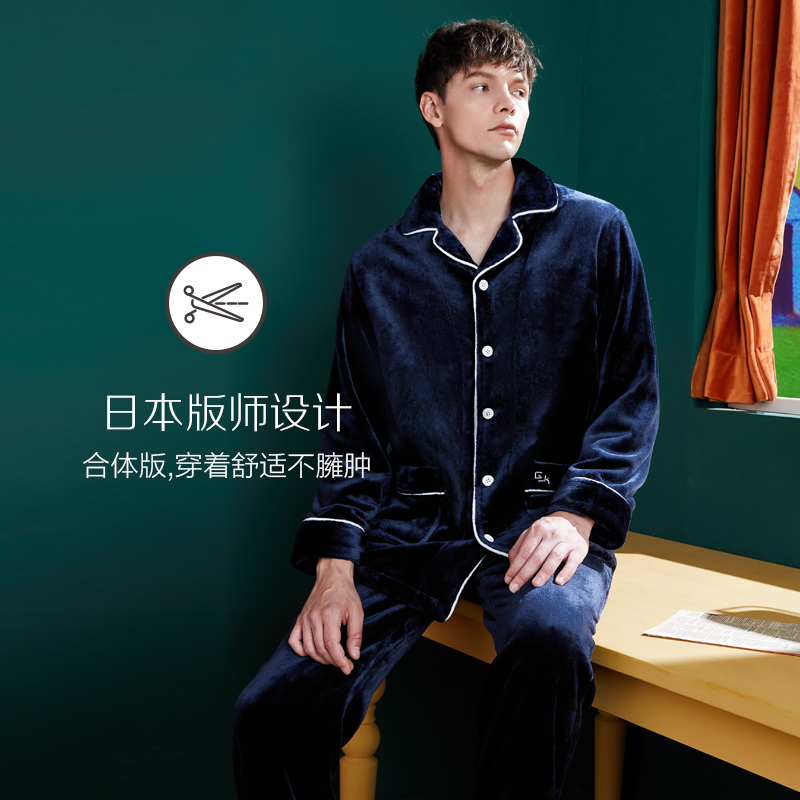 Red bean men's coral fleece pajamas thickened plush loose plus size warm autumn and winter flannnel home wear set
