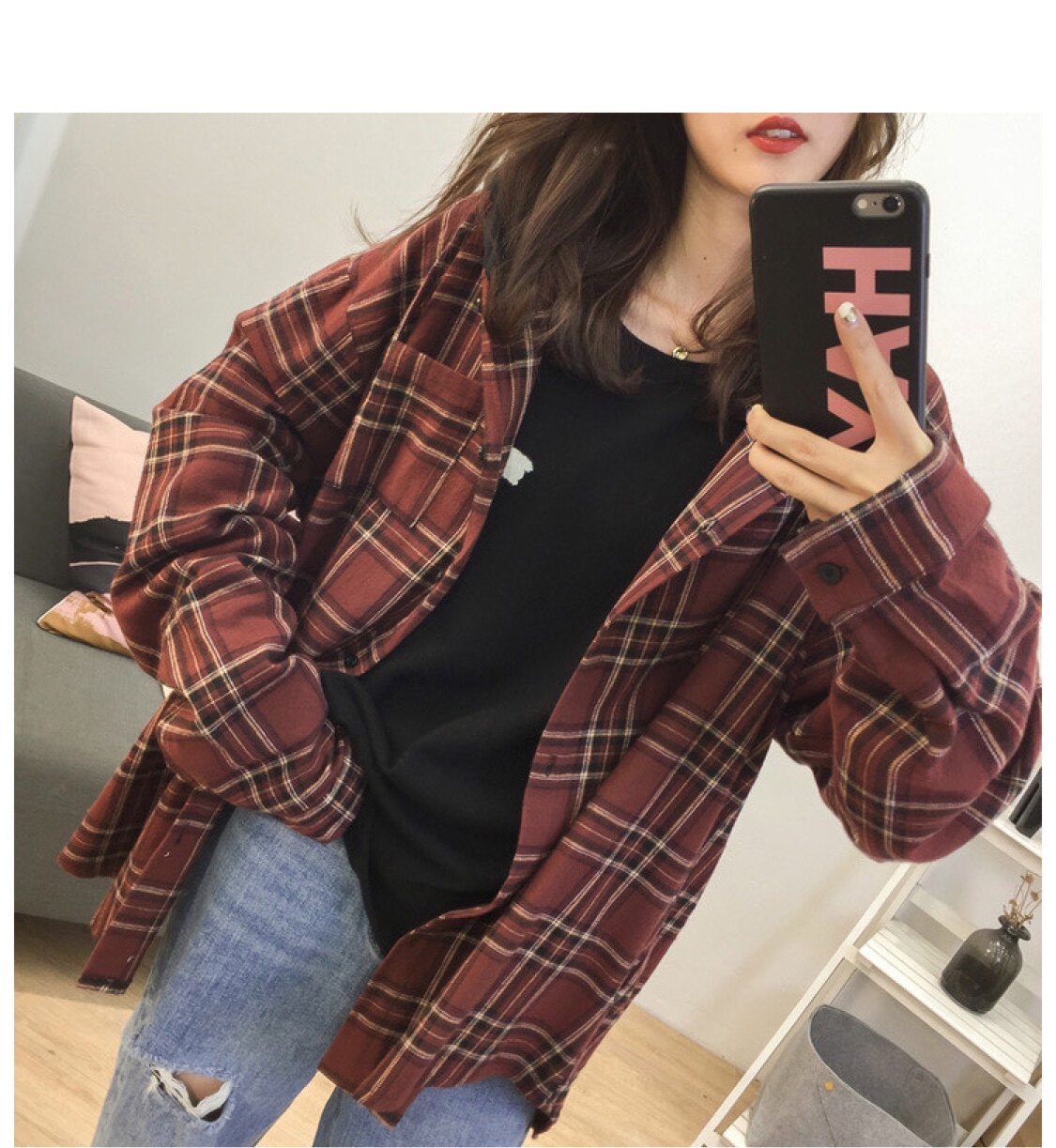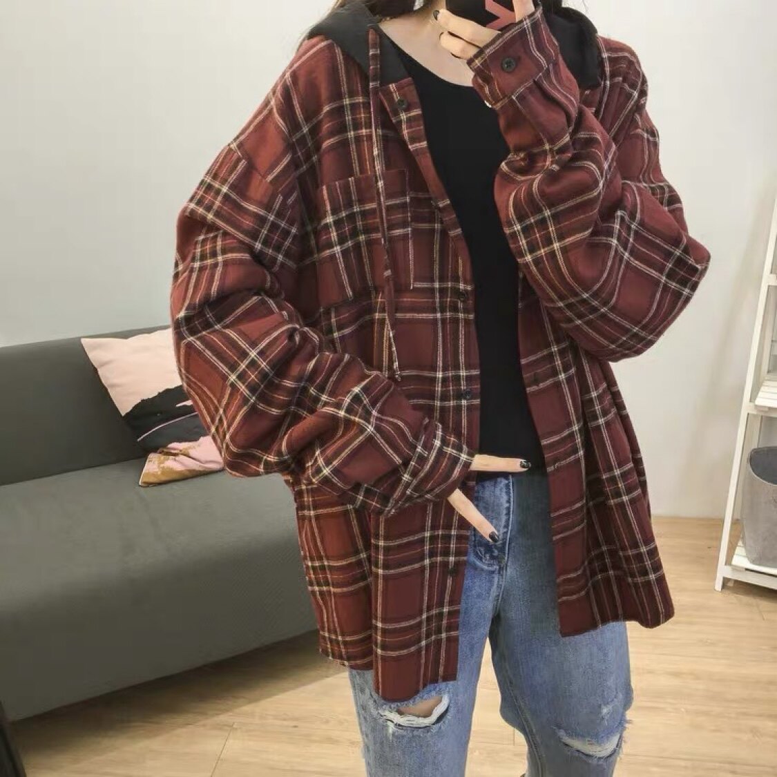 Japanese SLY hooded plaid shirt women's spring and autumn new loose long-sleeved tops age-reducing mid-length jackets