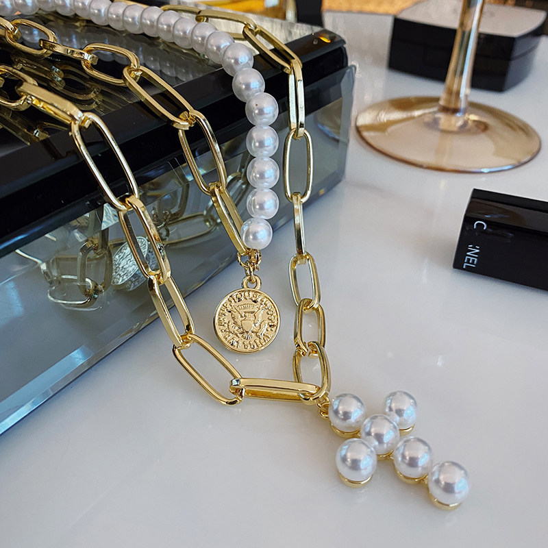 Casual uninhibited two-piece set can be split A pearl chain round brand necklace B chain pearl cross necklace
