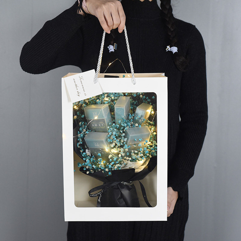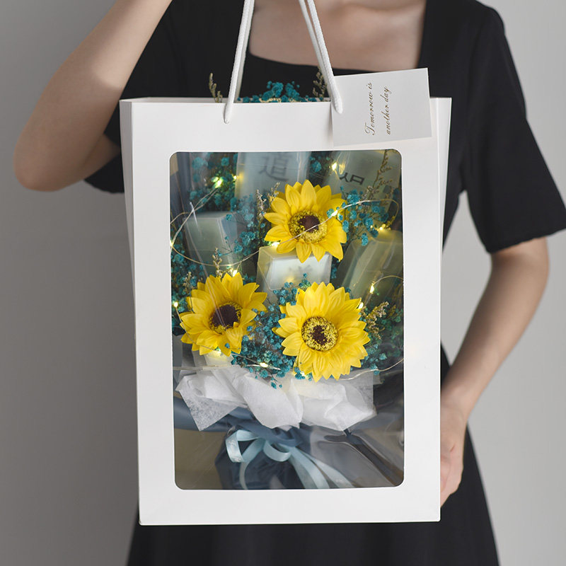 Bookmark and buy free light strings. Blue baby's breath, 5 boxes, finished product, 3 yellow sunflowers, blue baby's breath milk tea color packaging, 3 white roses, crystal grass, 3 blue roses, blue baby's breath calm black