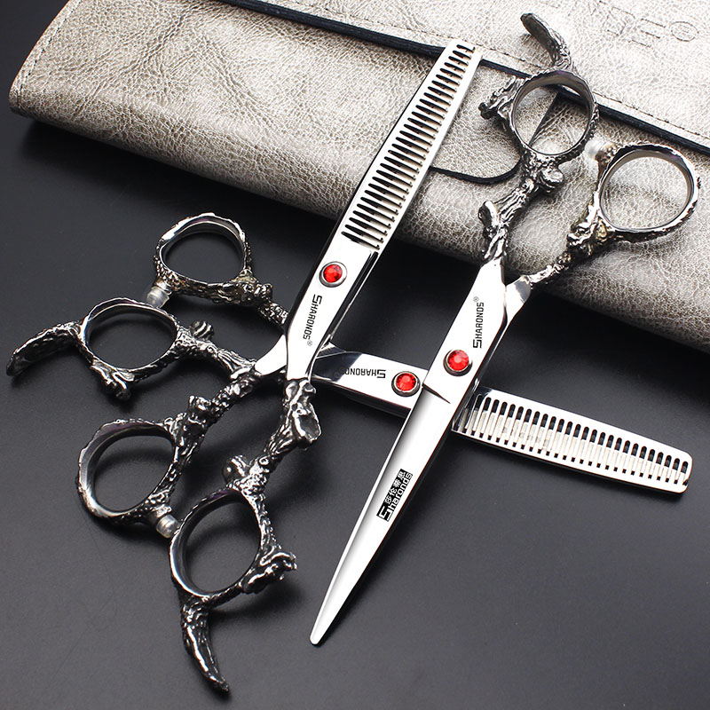 Professional hair stylist hairdressing scissors 6 inches flat shear teeth scissors personalized hair salon 7 inches black dragon handle haircut thinning knife scissors