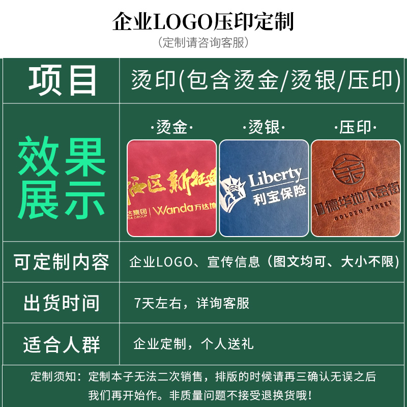 A variety of spot 1 piece = 50 copies (1 book is on sale, you can contact customer service for a small number of samples) This store supports all kinds of notebooks full customization (specific please consult customer service) A5 black - soft sheep skin (50 books) A5 gray - soft sheep skin (50 books) A5 brown - soft sheep skin (50 books) A5 royal blue - soft sheep skin (50 books) A5 dark green - soft sheep skin (50 books) A5 blue - window flower copper buckle (50 books) A5 black - window flower copper buckle (50 books) A5 Gray - Window Flower Copper Buckle (50 books) A5 Red - Window Flower Copper Buckle (50 books) A5 Brown - Window Flower Copper Buckle (50 books) A5 - Soft Leather Simple Thin (50 books Four colors optional color available) A5 Blue - Soft Leather Business (50 books) A5 Black - Soft Leather Business (50 books) A5 Red - Soft Leather Business (50 books) A5 Brown - Soft Leather Business Model (50 books) A5 Blue - Hard Leather Latch (50 books) A5 Black - Hard Leather LockEd Trim (50 books) A5 Black - Hard Leather LockEd Trim (50 books) A5 Red - Hard Leather LockEd Edge (50 books) A5 Brown - Hard Leather LockEd Edge (50 books) A5 Bright Coffee - Hard Leather LockEd Edge (50 books) A5 Braided Black - Hard Leather LockEd Edge (50 books) A5 Blue - Soft Leather Thread (50 books) A5 Black - Soft Leather Thread (50 books) A5 Gray - Soft Leather Line (50 books) A5 Brown - Soft Leather Line (50 books) A5 Dark Green - Soft Leather Line (50 books) A5 - Classic Color-Changing Leather (50 books) A5-Soft leather sprayed leather (50 books, five colors optional, noteable color) A5-Korean color-changing leather (50 books, four colors optional, noteable colors) A5-pocket color change leather (50 books, six colors optional, noteable colors) A5-metal buckle color change leather (50 books, six colors optional, noteable colors) A5-square buckle color change leather (50 books, six colors optional, noteable colors) A5-color tri-fold magnetic buckle (50 books, five colors optional, noteable colors) A5-six-hole loose-leaf style (50 books, four colors optional, noteable colors) B5-Window Flower Copper Buckle (50 books Five colors optional Note color) B5-Soft sheep skin (50 books Five colors optional Note color) B5-Soft leather line model (50 books Five colors optional Can be noted color) B5- Hard leather lock hem model (50 books Six colors optional note color) A6-Korean color change leather (50 books Five colors optional can be noted color) Black gift box customization (50 sets of minimum can be wild any model Default does not include the book) Red gift box customization (50 sets of minimum can be wild any model Does not include the book by default) Other - Custom special auction