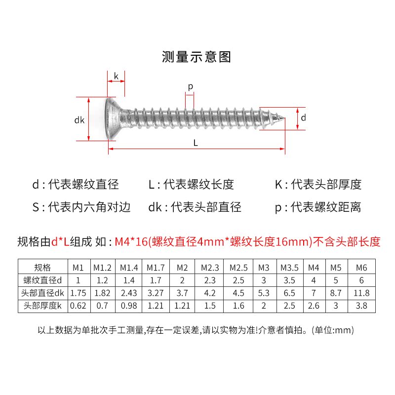 304 stainless steel self-tapping screw cross countersunk head screw flat head KA Wood screw extended screw M3M4M5