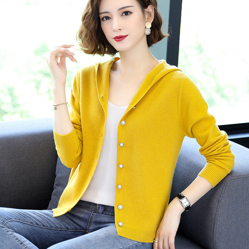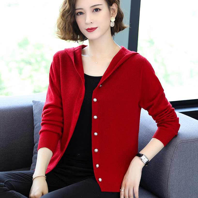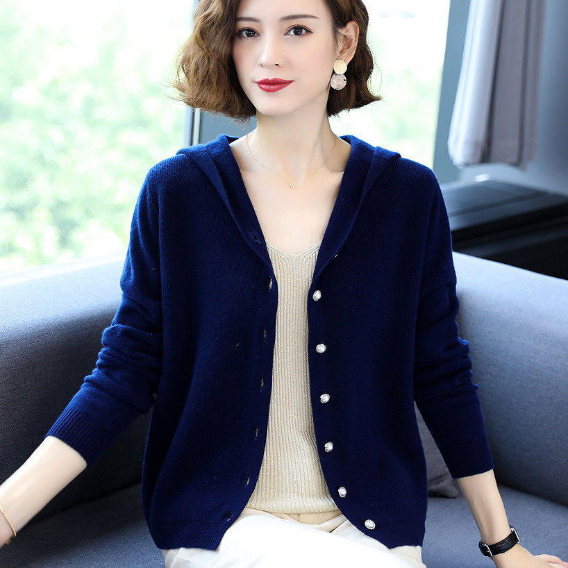 Knitted cardigan ladies coat sweater loose early autumn and winter hooded V-neck top 100 pure wool sweater sweater