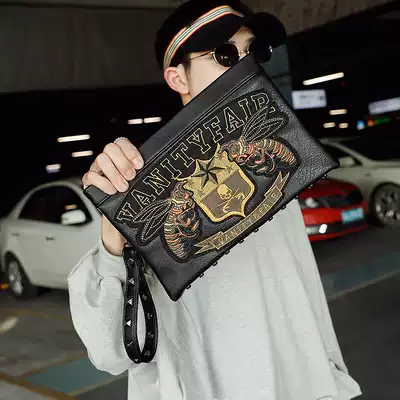Hong Kong personality embroidery pattern new men's clutch large-capacity leather clutch youth handbag trend