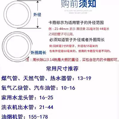 8-12mm (pipe clamp) 9-16mm (pipe clamp) 13-19mm (commonly used for gas pipe) 16-25mm(4 points commonly used) 18-32mm (pipe hoop) 19