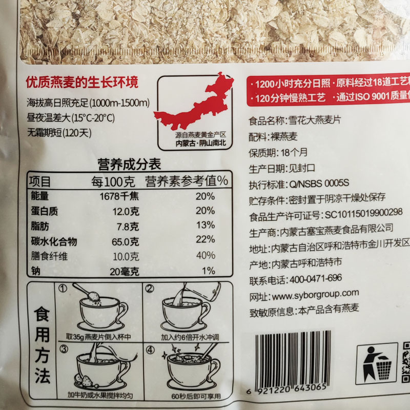 Sebao oatmeal 1000g ready-to-eat cereal Nemonte produced Saibao oat bagged breakfast pure cereal