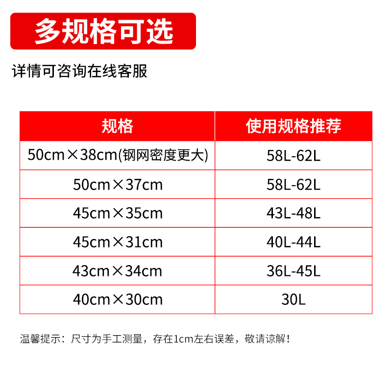 Galvanized steel 40*29CM (suitable for 30L) Galvanized steel 43*34CM (36L~45L) Galvanized steel 45*31CM (40L~44L) Galvanized steel 45