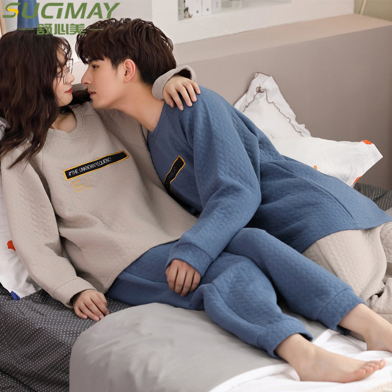 Couple sleeping clothes autumn and winter style women air cotton pure cotton long sleeve sandwich clip cotton men's spring and autumn thin family clothes suit