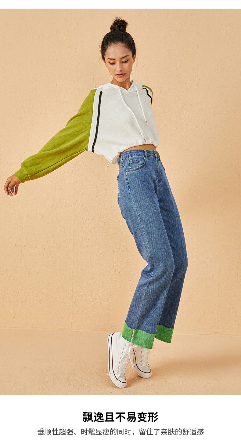 Korean version sp68 spring hit color feet edge curling rubber waist washed blue high slingshot straight barrel casual jeans women