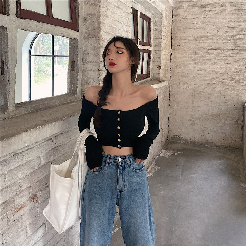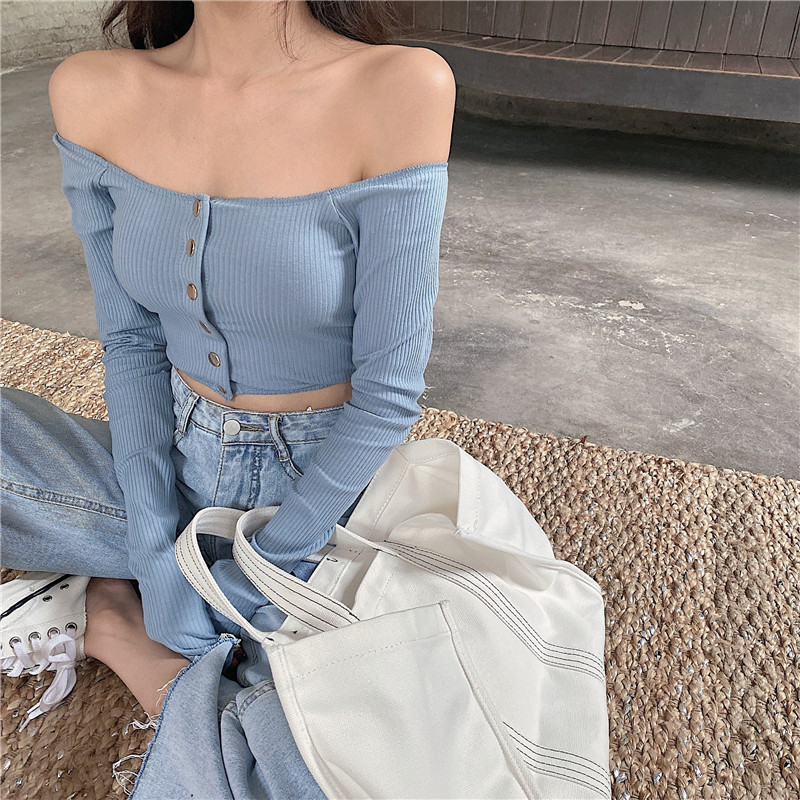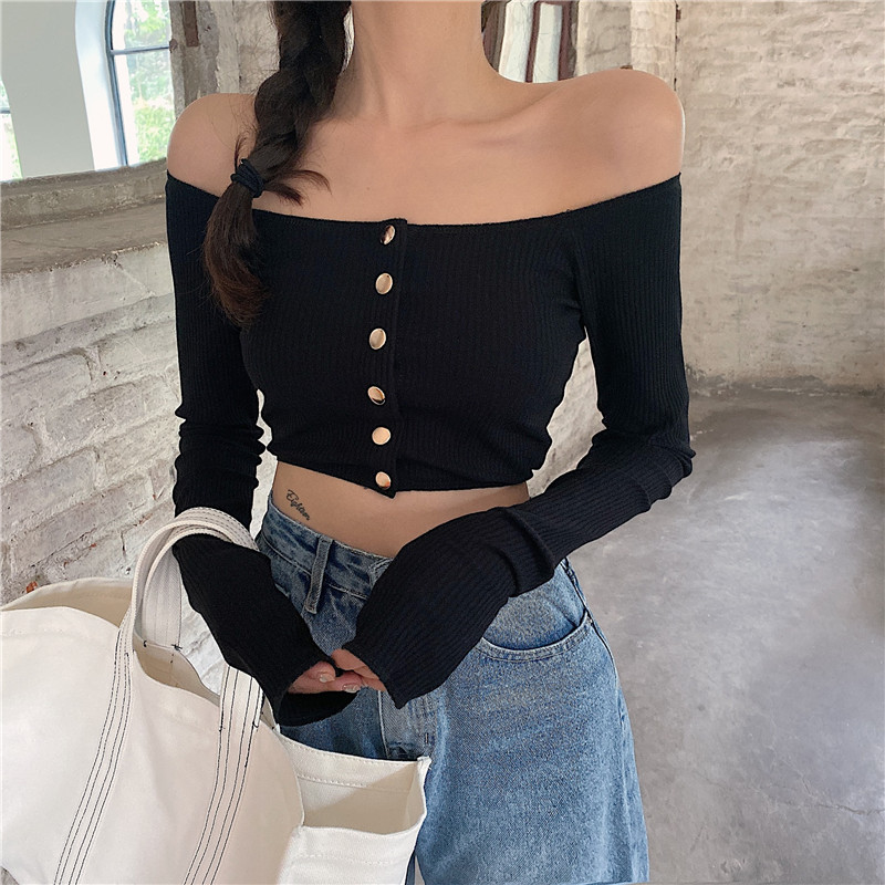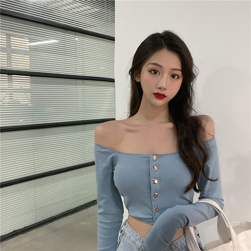 ins short paragraph 100 lap blouse with slim lock bone cardigan design sense of the undershirt sexy straight shoulder long sleeve T-shirt autumn and winter