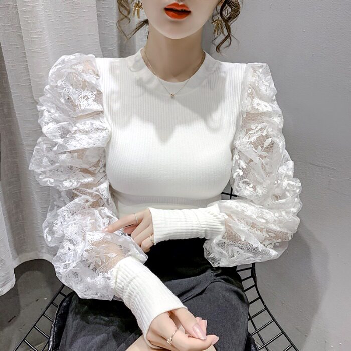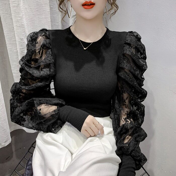 Round Collar Bubble Cuff Lace Knit T-shirt Woman 2020 New Early Autumn Han Version Foreign Pie slim jacket Long sleeves