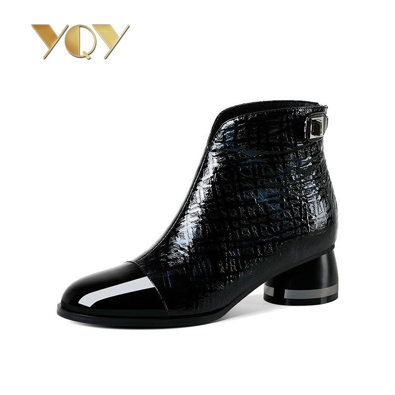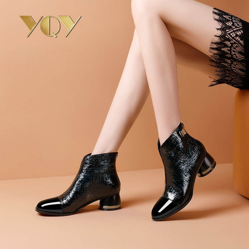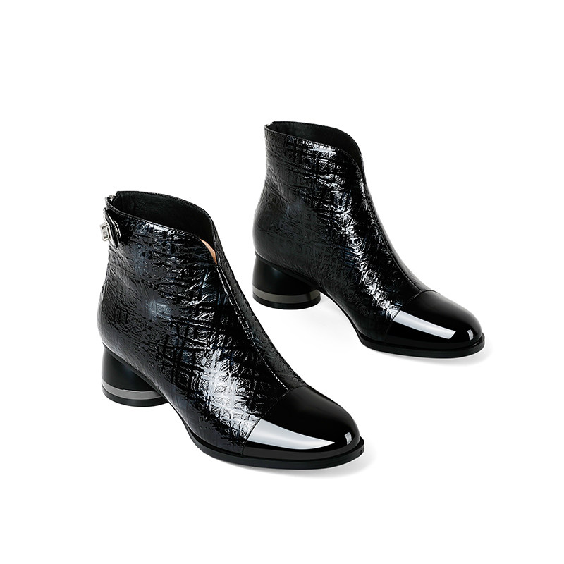 Round toe short boots women's shoes autumn and winter 2022 new mid-heel patent leather boots women's plus velvet leather boots thick heel leather women's boots