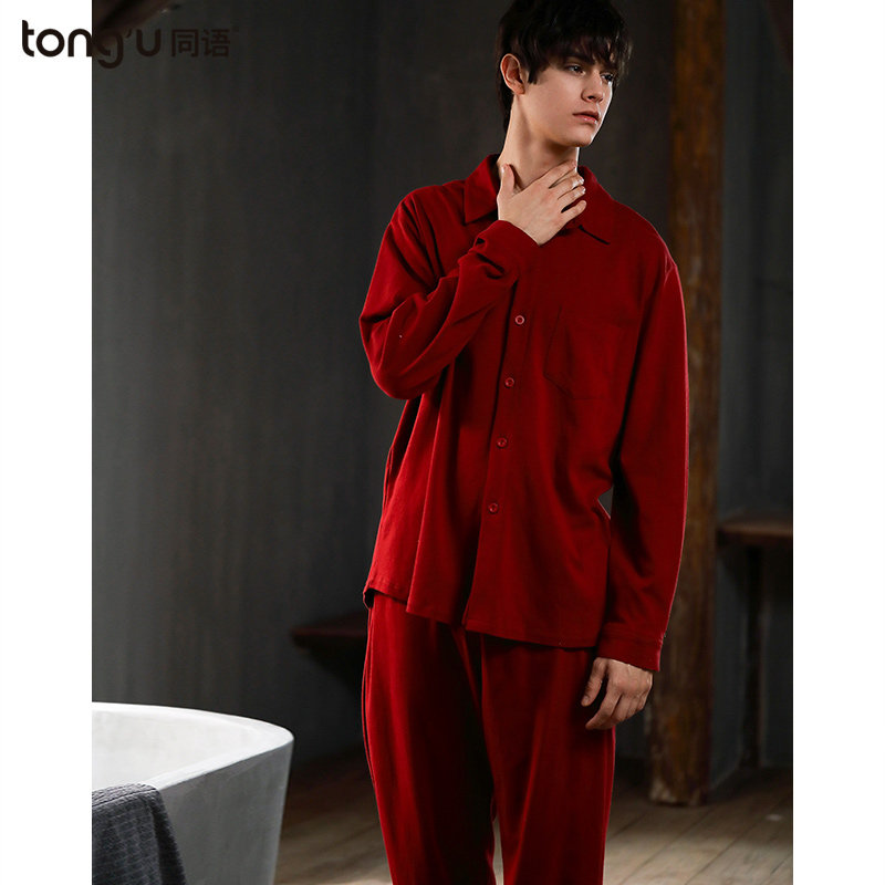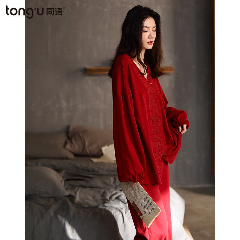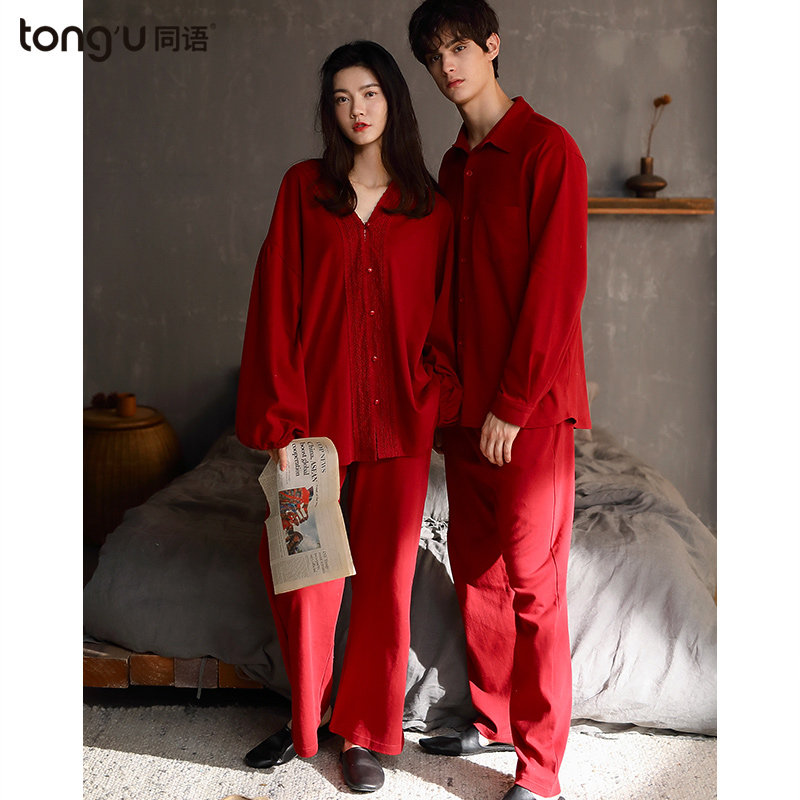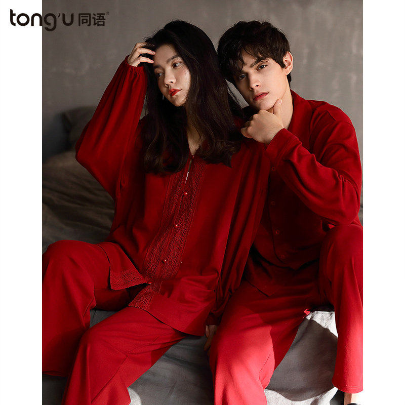 Same language couple pajamas spring and autumn cotton long sleeve thin home clothes female red newlywed two-piece set autumn and winter Cotton