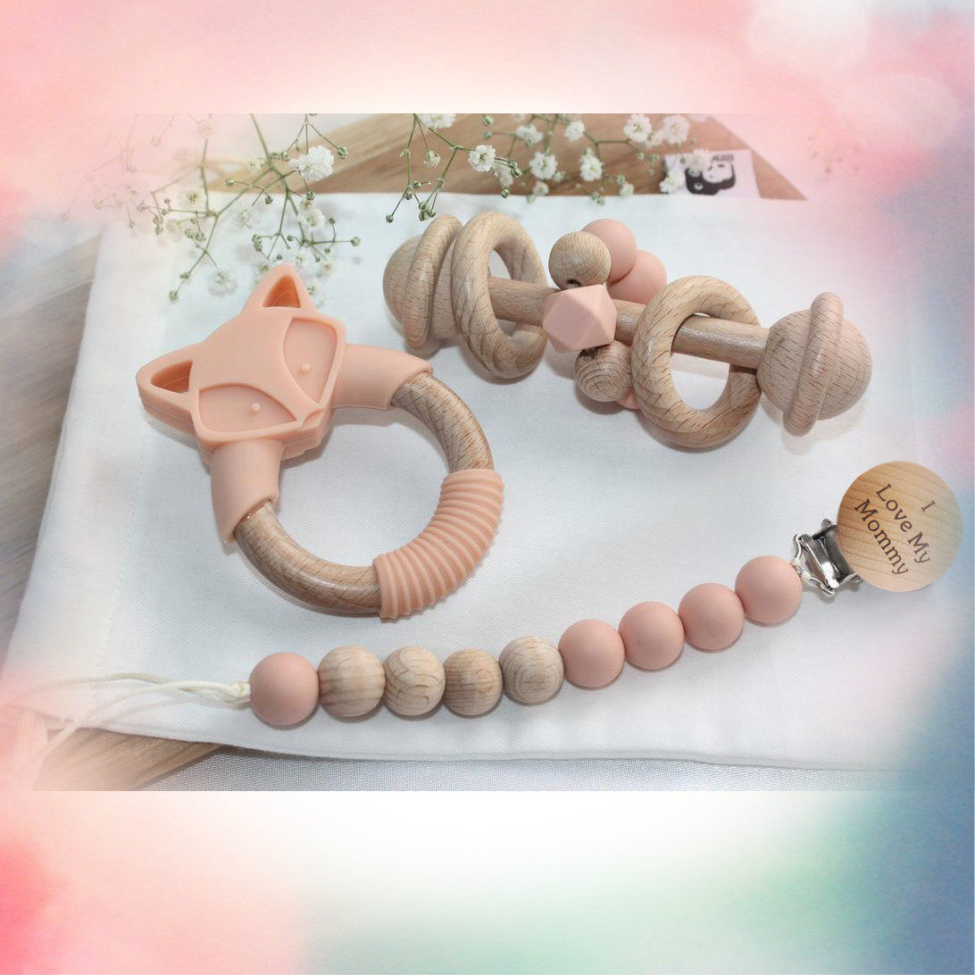 Baby pacifier anti-drop chain fox tooth fixer wooden planet molar stick rattle set three-piece set of food-grade silicone