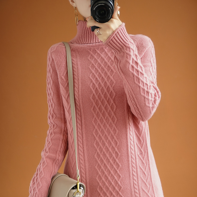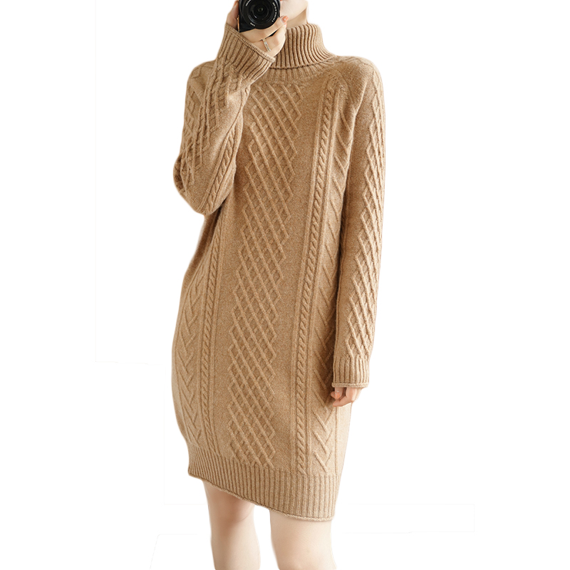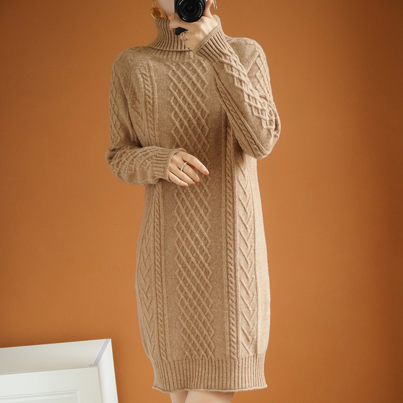 Autumn Winter Thickened Wool Ocean Dress Woman Autumn Winter Medium Long Version Loose High Collar Knit Ocean Dress Undercoat Dress