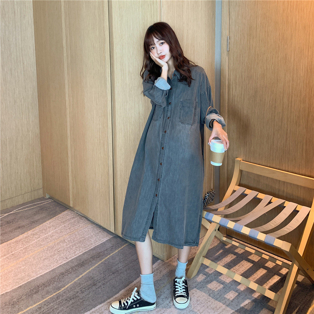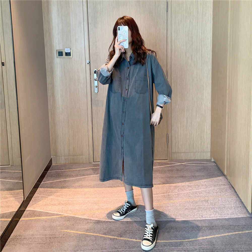Maternity shirt Long sleeve jacket spring and autumn Korean nursing skirt Large size long fashion denim dress top tide mom
