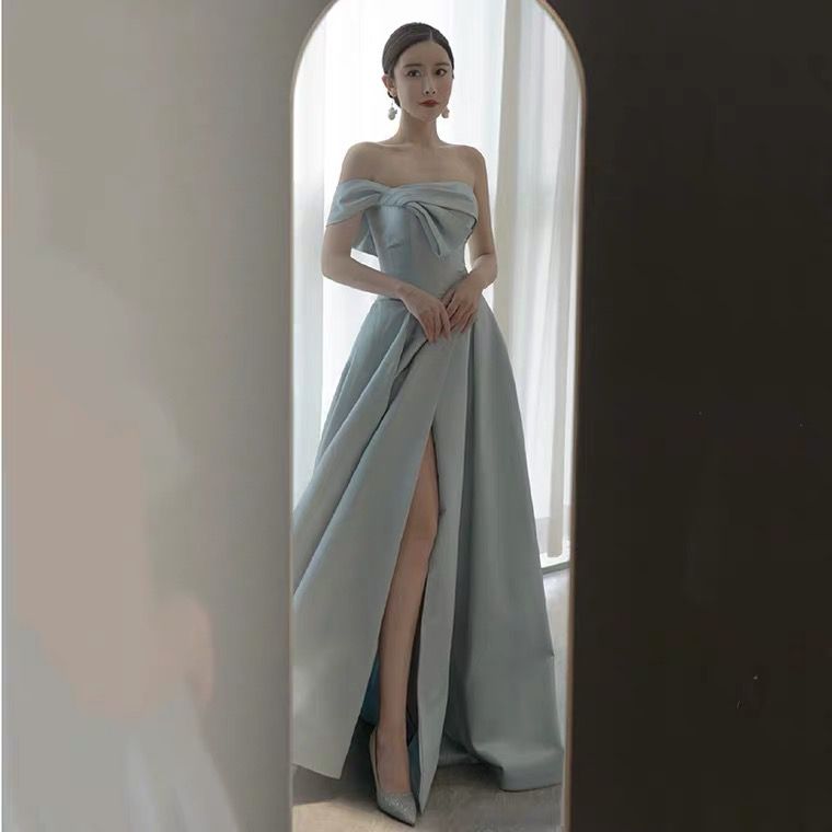 Light blue satin one-shoulder evening dress temperament bride toast dress party stage performance host dinner dress