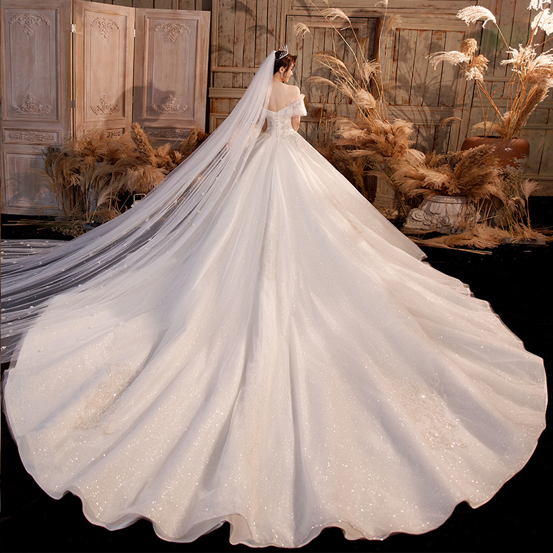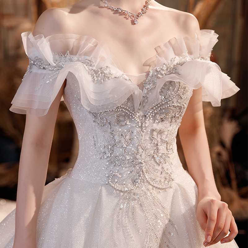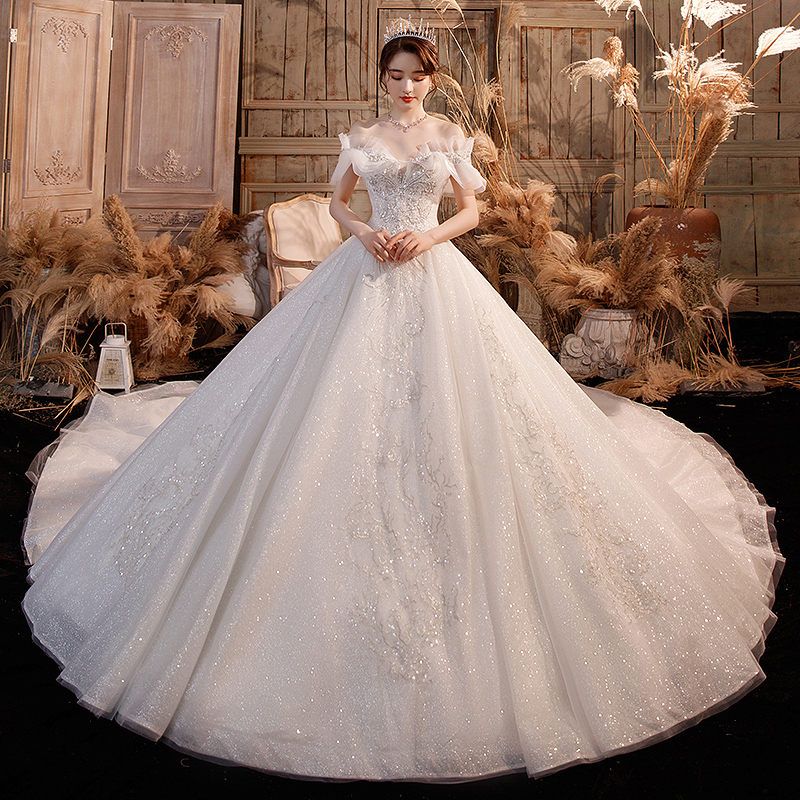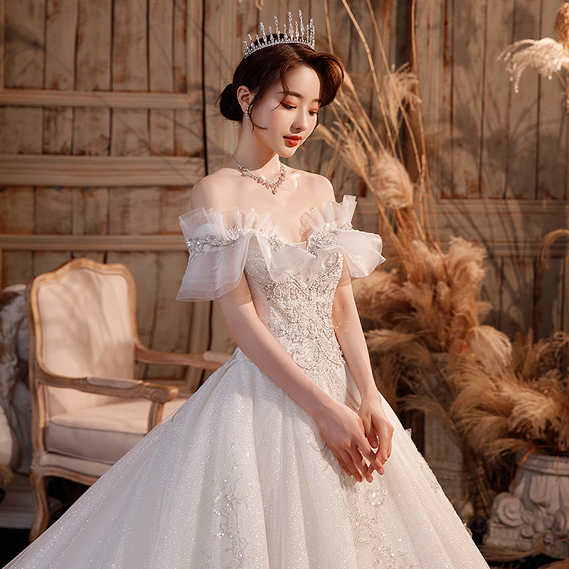 High-end Korean version with a shoulder light wedding dress 2022 new bridal main yarn Super fairy wedding senior texture Heavy work extravaganza