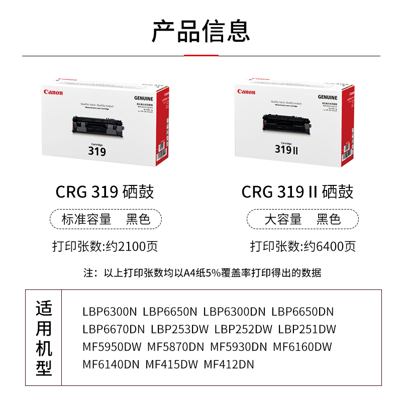CRG-319 Toner Cartridge-Standard package-2100 pages CRG-319II Toner Cartridge-large capacity package-6400 pages Order to send a Canon eco-friendly bag