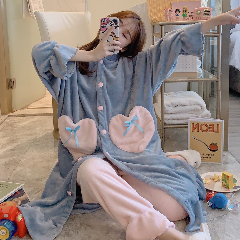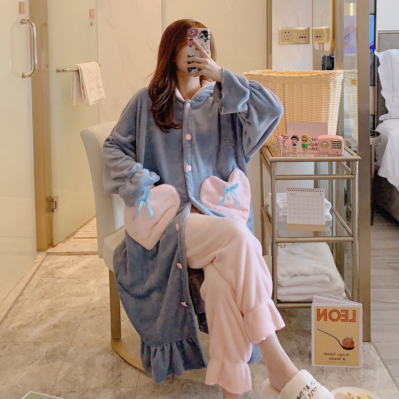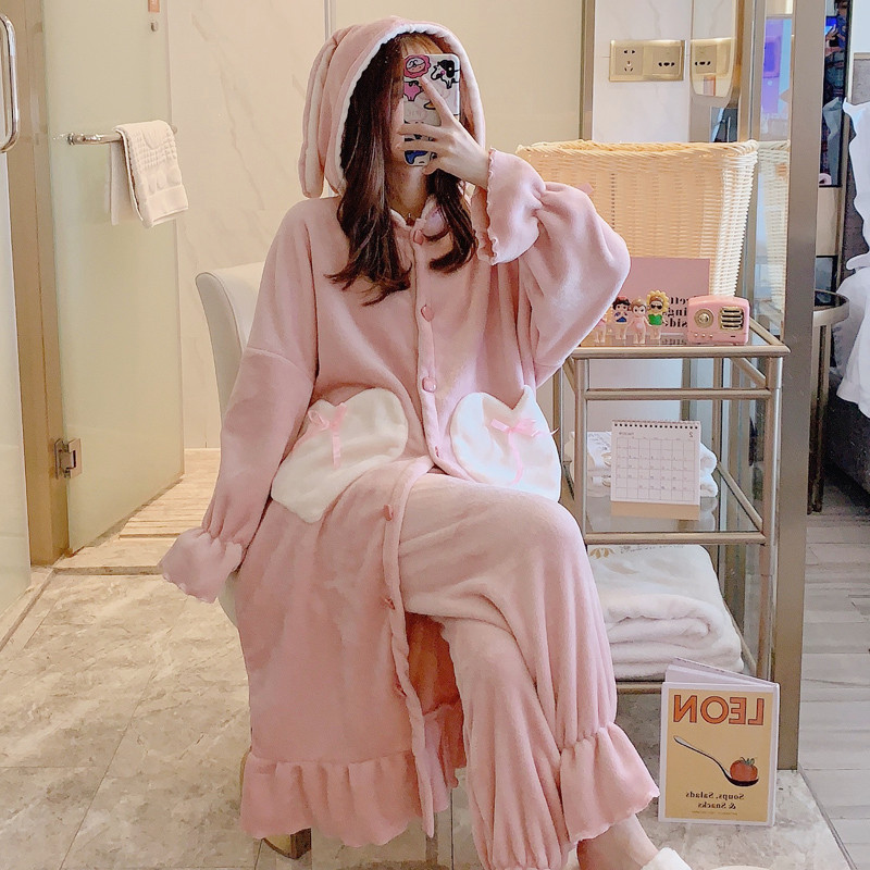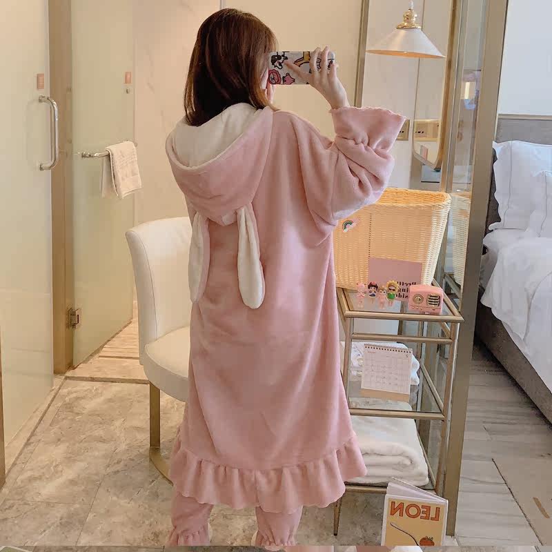 Cartoon Cute Rabbit Ears Pyjamas Woman Autumn Winter Thickened Flannel Pyjamas with cap Long sleeves Sleeping Skirt Bathrobe Woman Winter