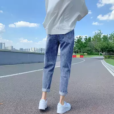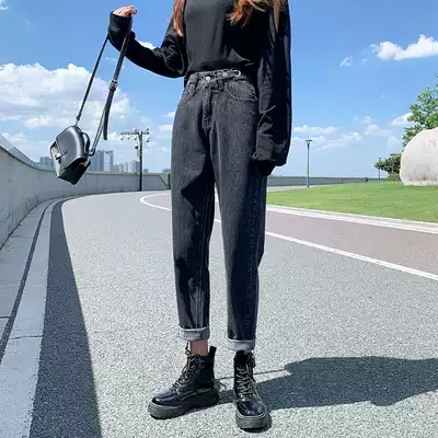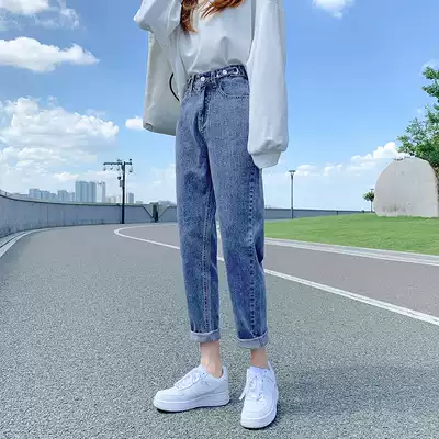 Jeans women's high waist thin dad pants 2021 summer new nine-point straight loose ribbed harem pants tide