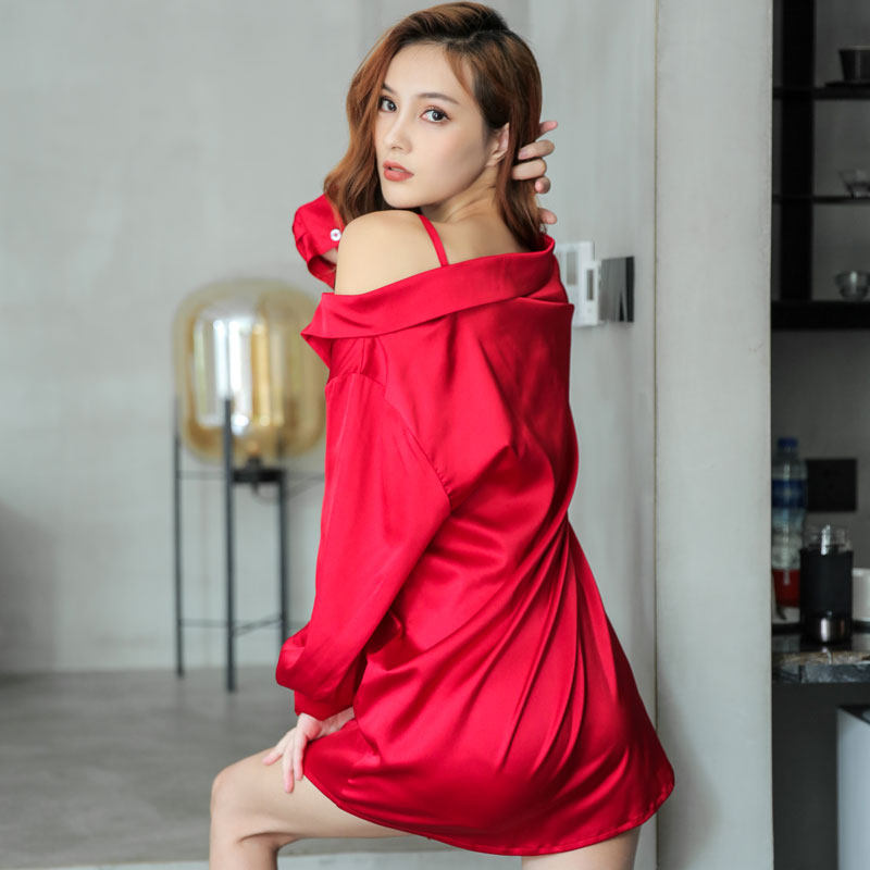 New nightgown women spring and autumn summer ice silk long sleeves sexy off-the-shoulder white shirt boyfriend wind long silk pajamas