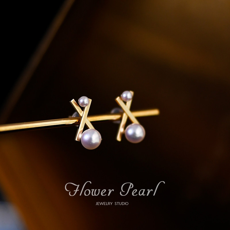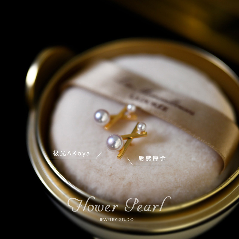 T - home balance beauty Japanese Aurora Akoya natural seawater pearl texture 18K gold cross - balance wooden ear needle