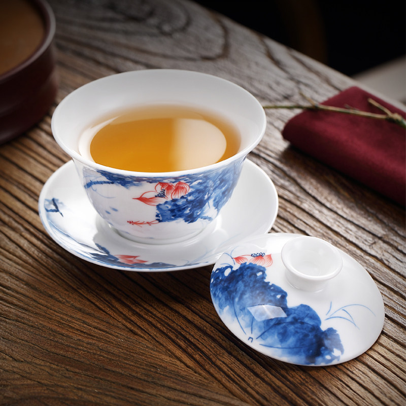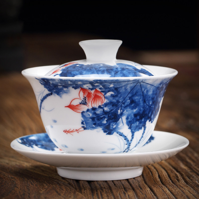 Painted Jingdezhen blue and white porcelain cover bowl teacup ceramic Sancai tea bowl set household tea making kung fu tea set single