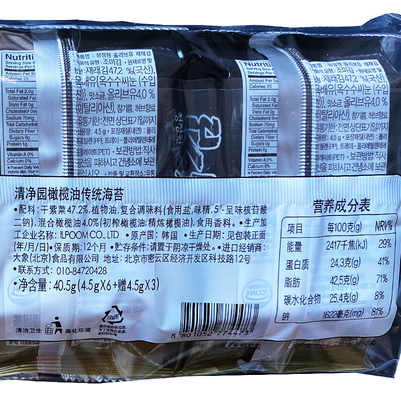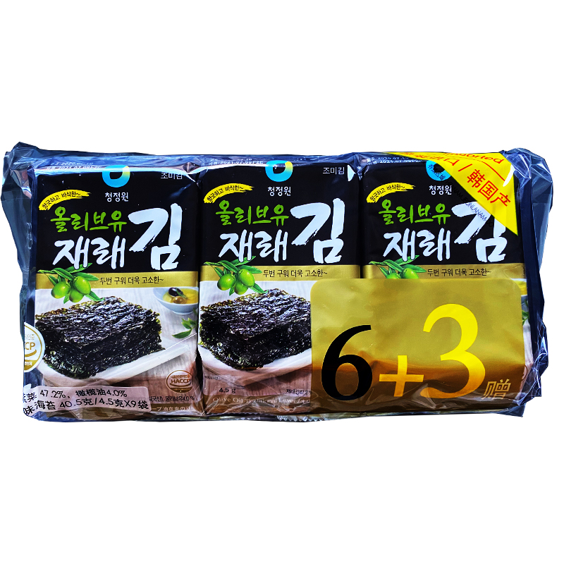 Korea imported Qingjingyuan olive oil seaweed 6+3 seaweed ready-to-eat children's snack sushi seaweed wrapped rice whole box