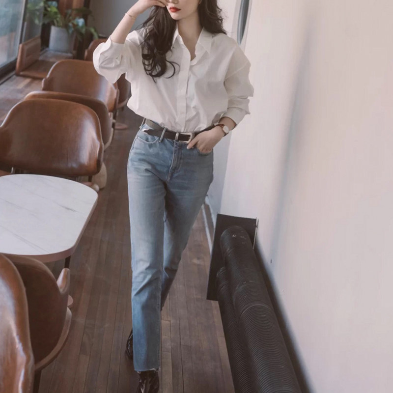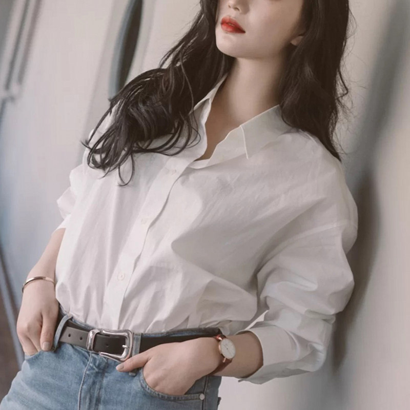 White Shirt Woman Loose Medium Long Version Casual Long Sleeve Pure Cotton Shirt Design Feel Small Crowdspring Summer Fold Wear