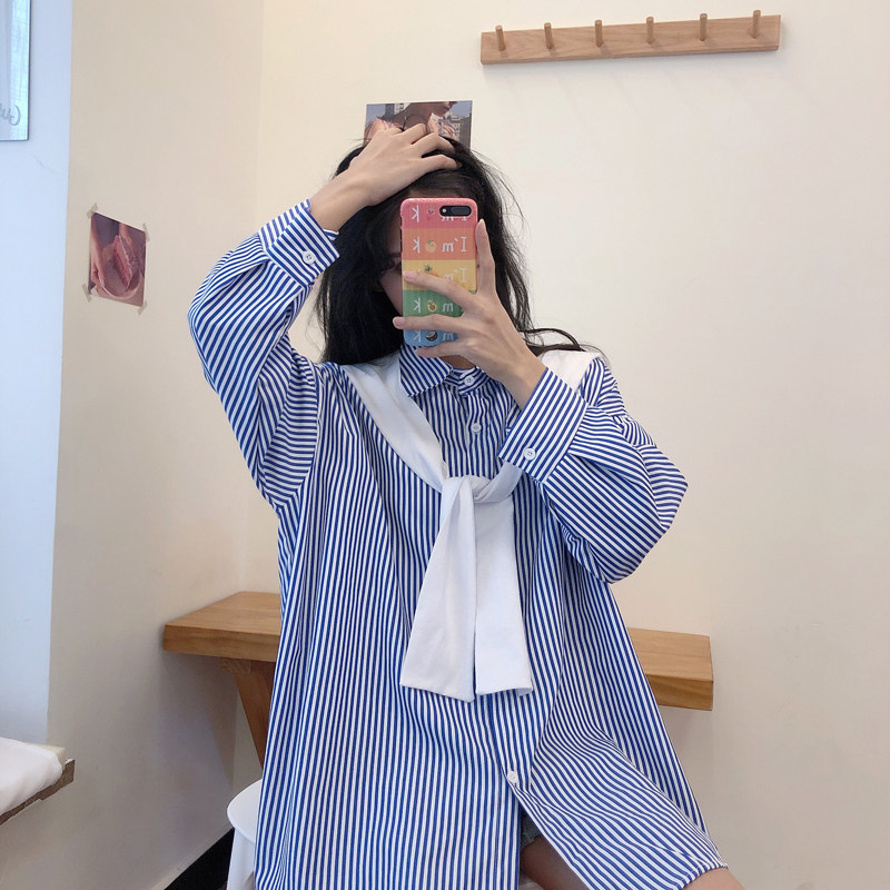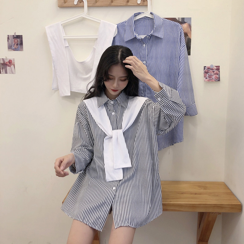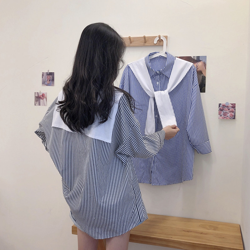 Blue striped shirt women's vertical striped shawl two-piece outer wear all-match early autumn design shirt fashion Western style