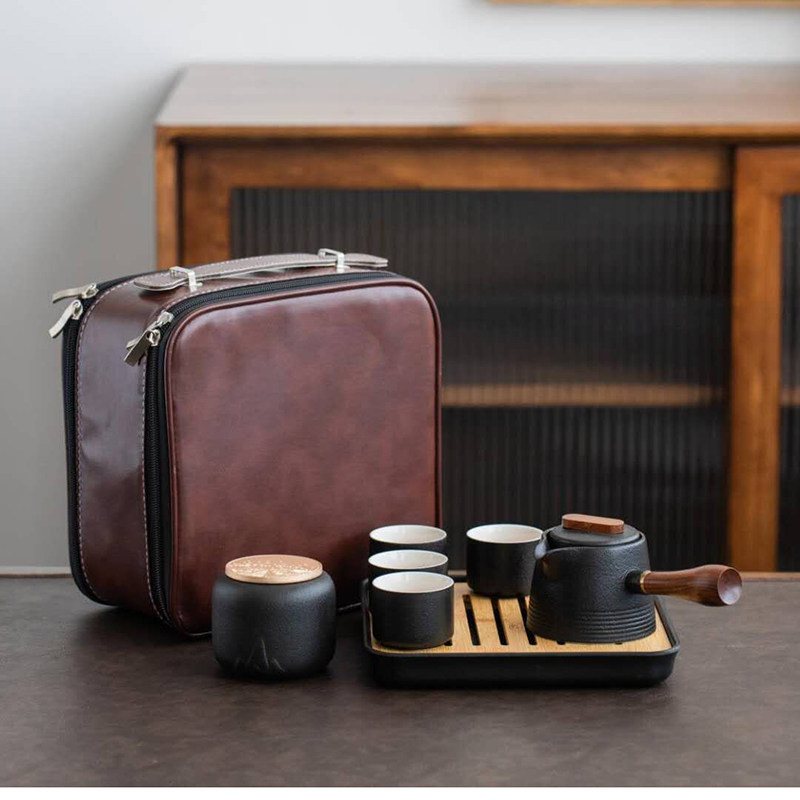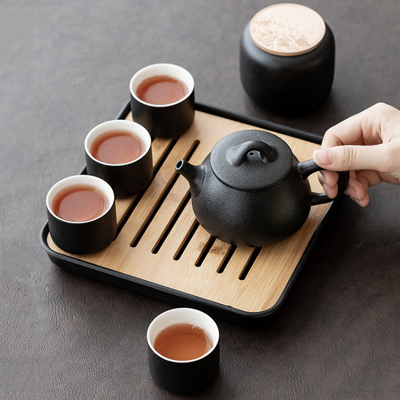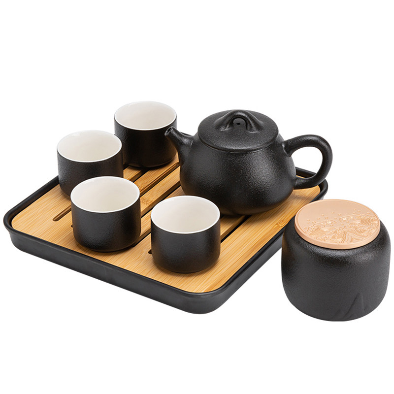 Black pottery travel tea set with tea tray home outdoor business travel portable kung fu tea set one pot four cups