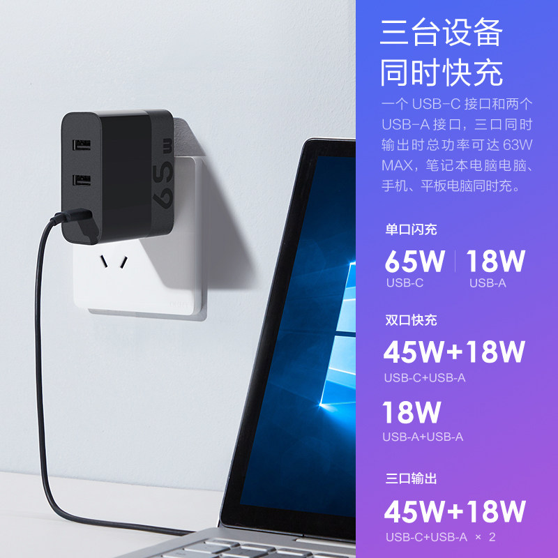 ZMI purple rice 65W charger Three-mouth PD Fast charge 65W Applicable iPhone12Pro Xiaomi mobile phone MacBook