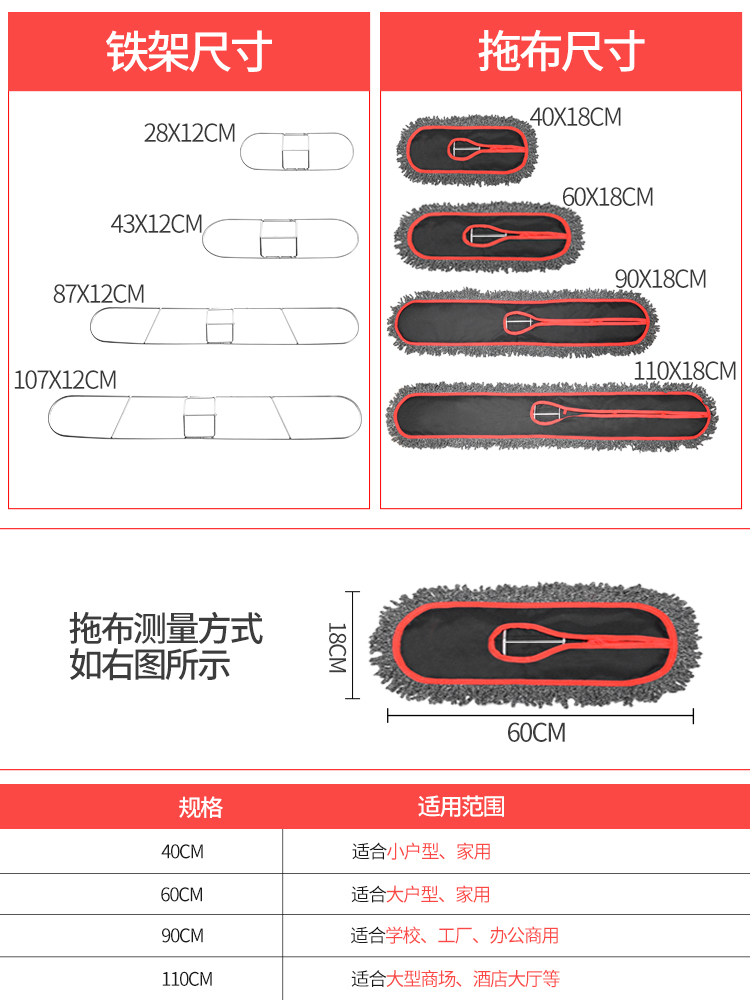 Thickened, stain-resistant, non-lint-resistant, 40cm black and red mop, a total of 1 piece of cloth (for small households) Dirt-resistant, thickened, non-lint-resistant, 60cm black and red mop, a total of 1 piece of cloth (large-sized household), stain-resistant