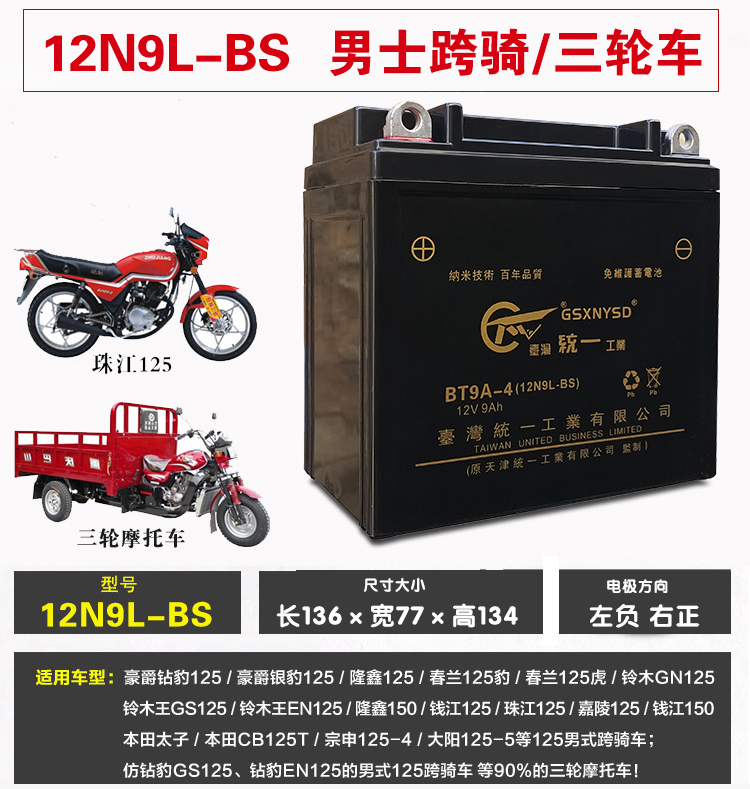 12v9AH Tricycle Motorcycle Cell Maintenance-free 12N9-4B-1 Silver Leopard Ruihuang Unified Ancient Vietnam 150 dry batteries