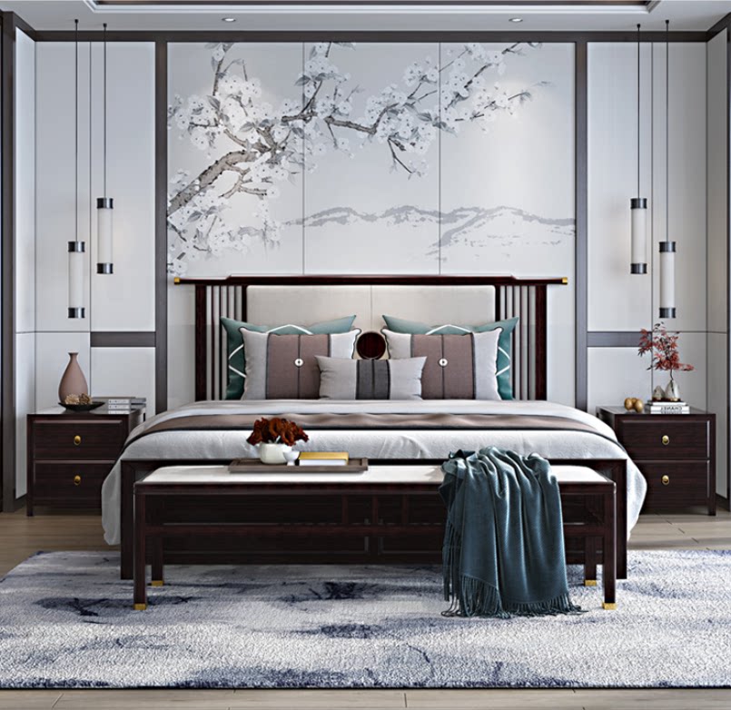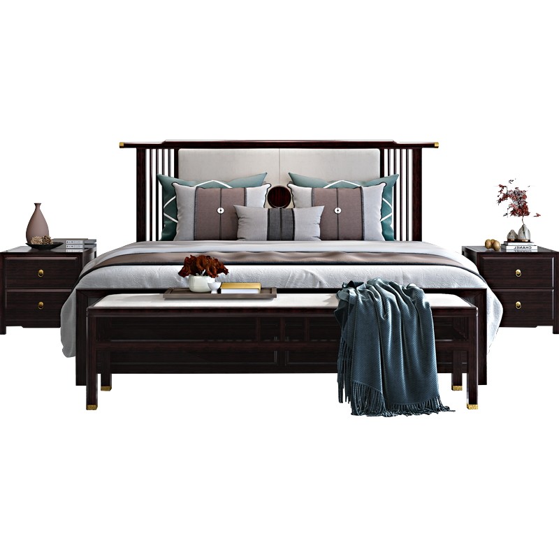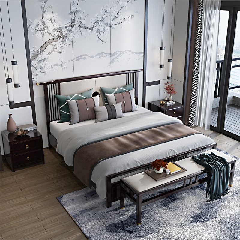 New Chinese style solid wood bed modern minimalist double bed bedroom Zen fabric bed 1 5 m 1 8 m wedding bed ash wood