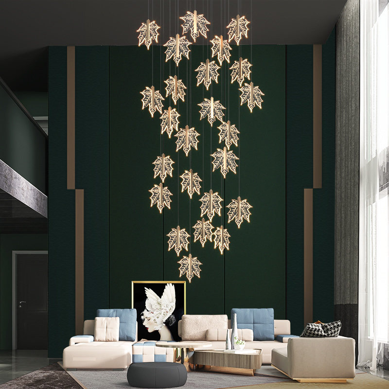 Duplex building chandelier large living room hotel long stairwell villa light luxury creative art personality dining room lamps maple leaf