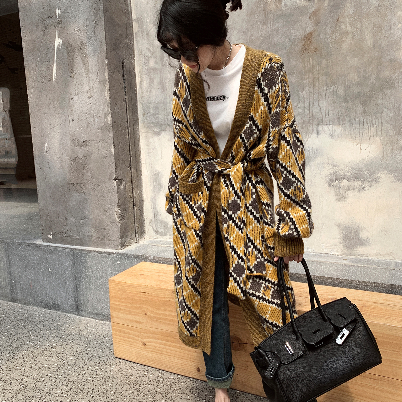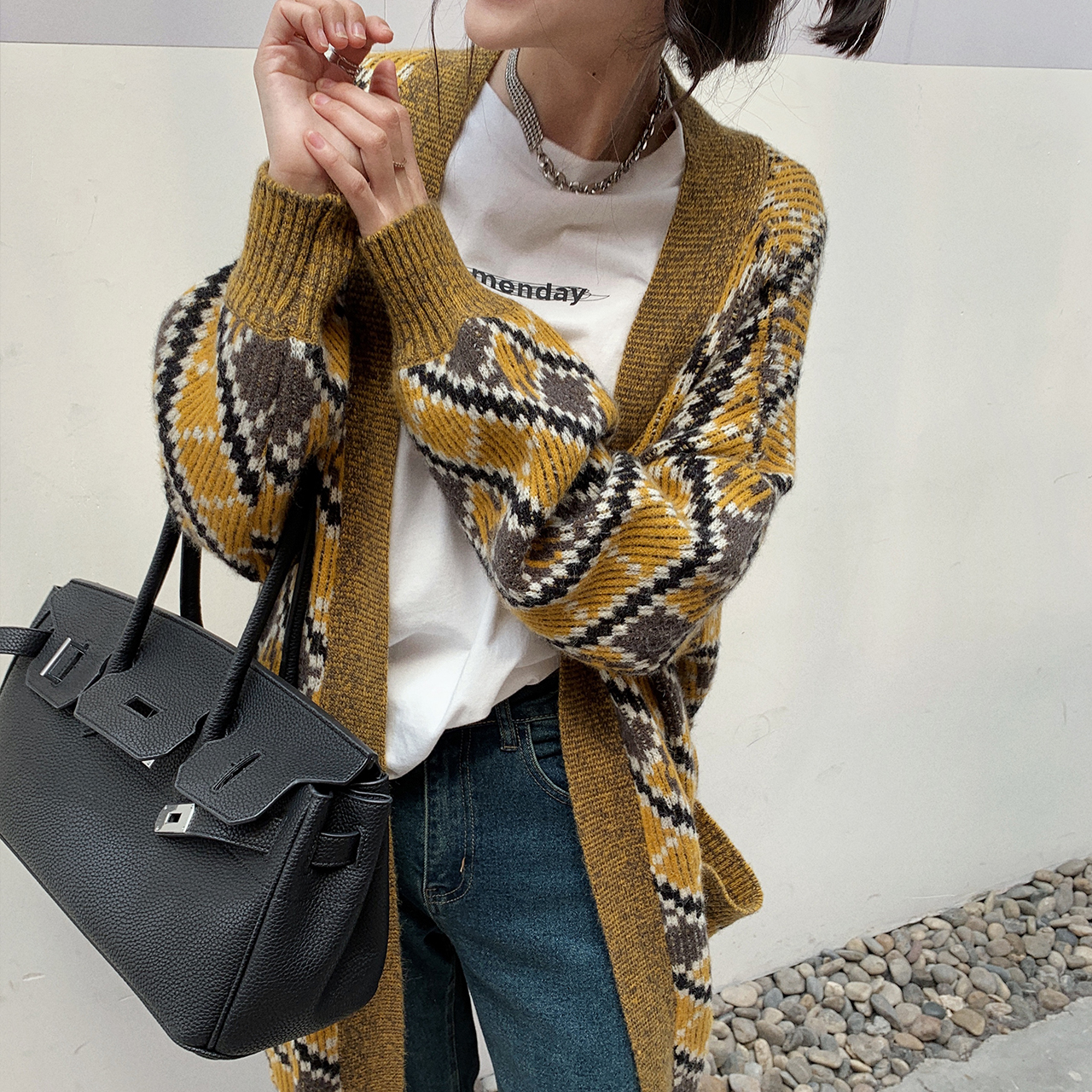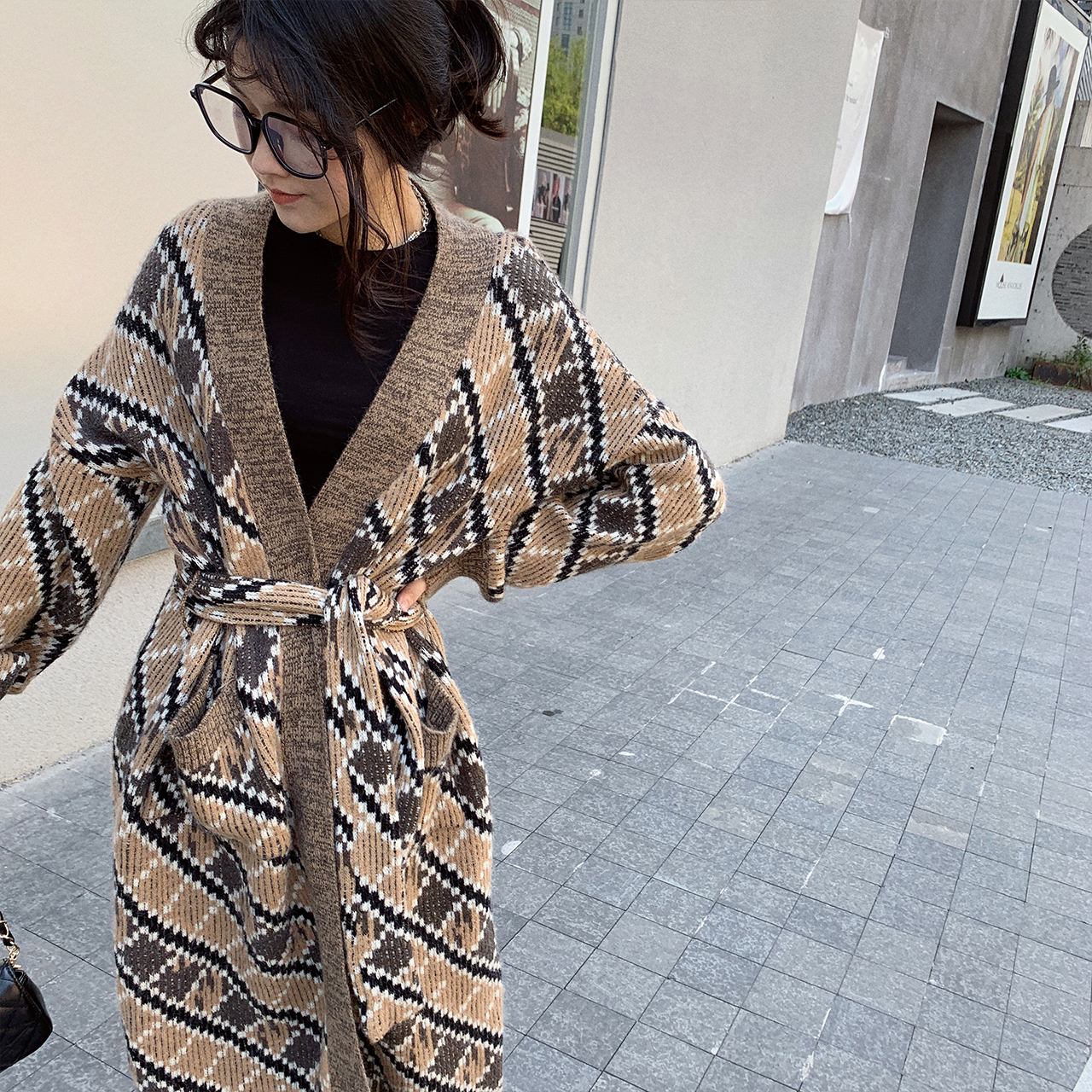 Personality Rhombus Crash Color Design V Collar Medium Long Version Knit Cardio-shirt 2022 Spring New Pint Trendy Lafur Lace Sweater