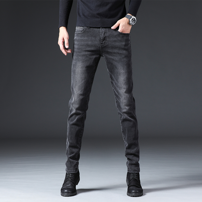 Hong Kong high-end black gray plus velvet jeans men's autumn and winter stretch tide brand slim small foot long pants spring and autumn