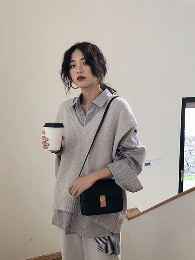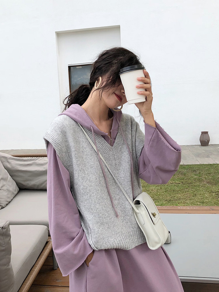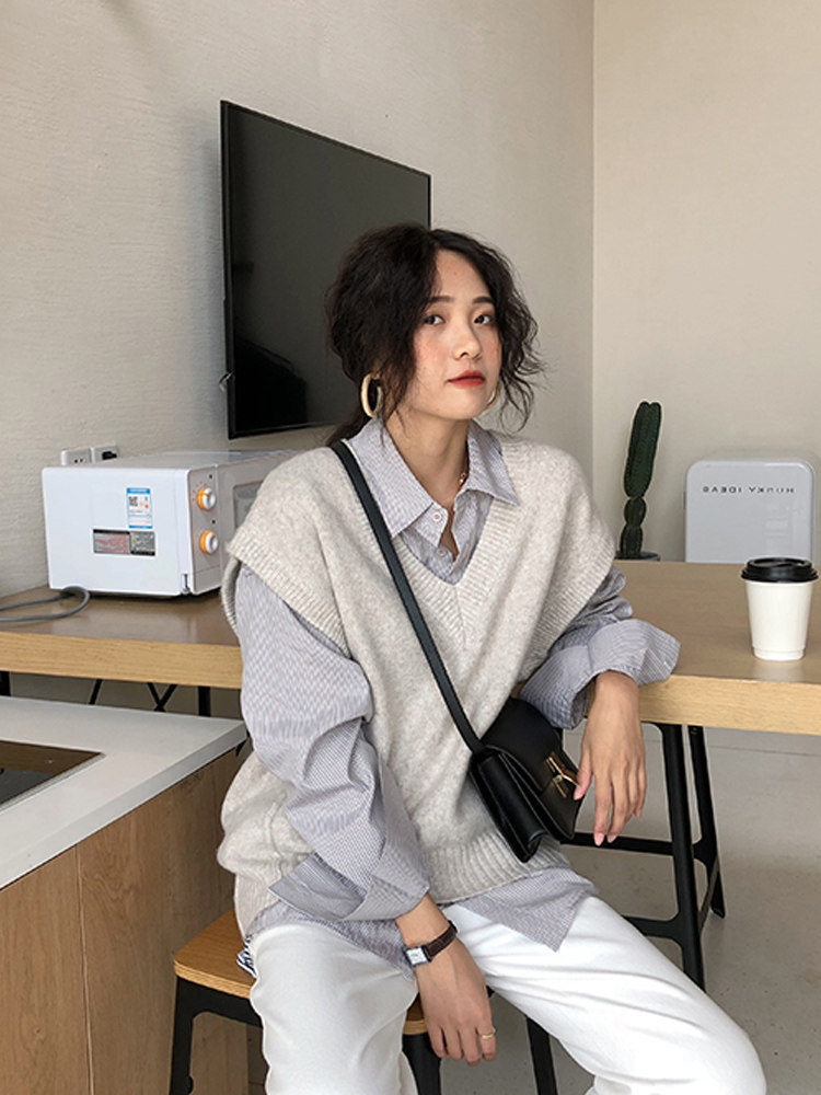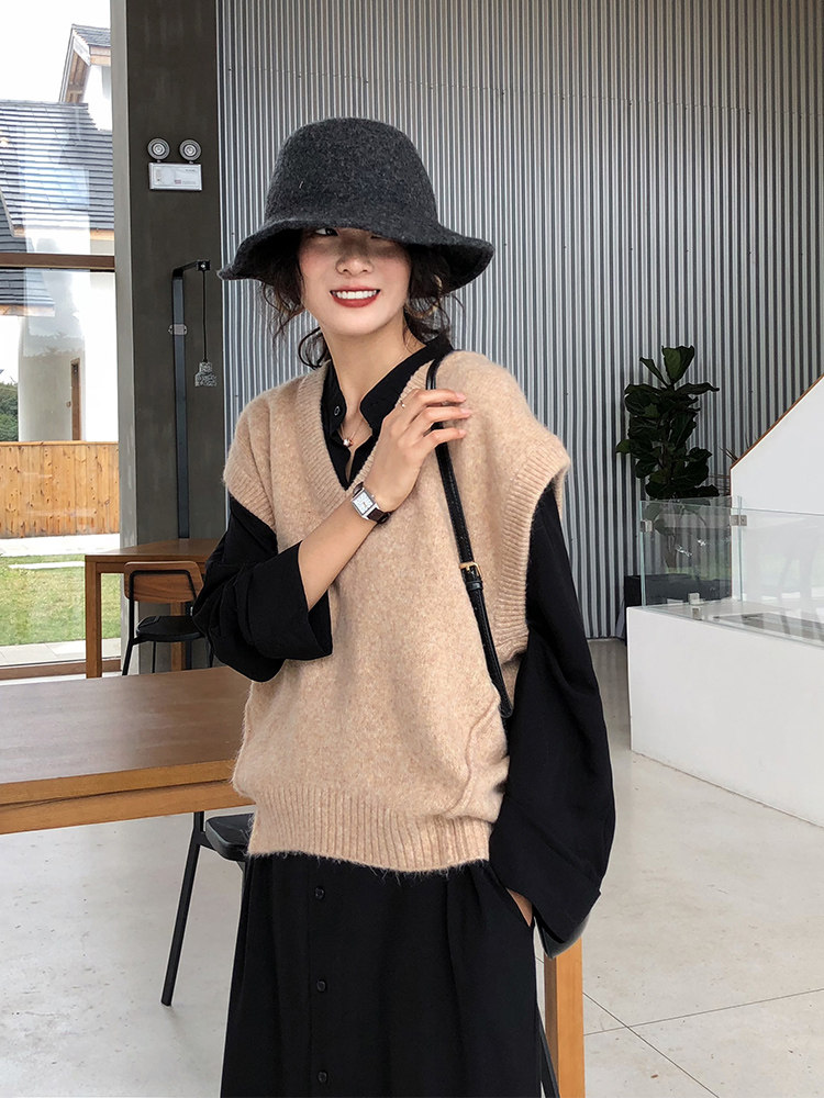 Autumn-winter style retro minimalist temperament sleeveless knit vest Lazy Loose 100 lap waistcoat V collar female sweater