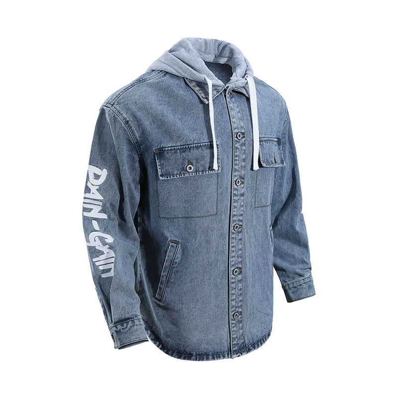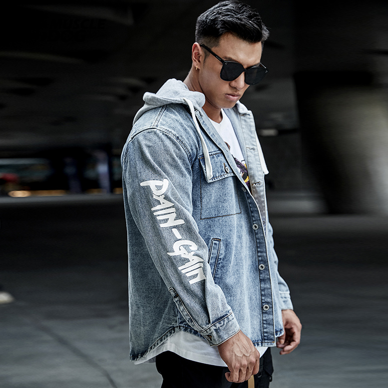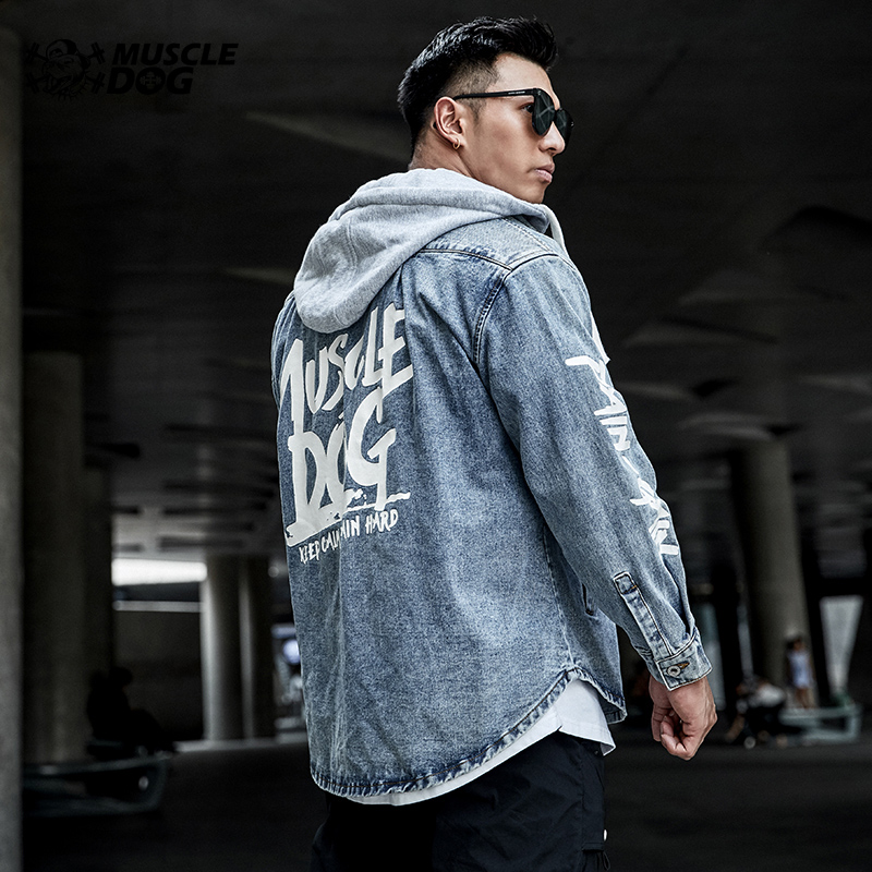Muscle dog trendy brand denim jacket Printed hooded fitness training casual sports loose jacket jacket men