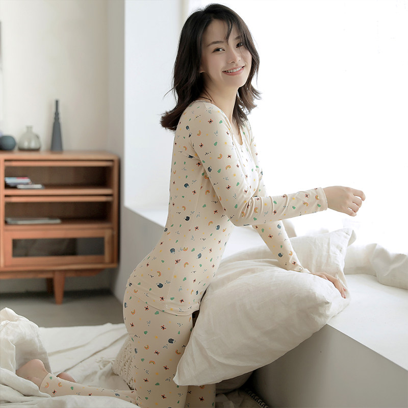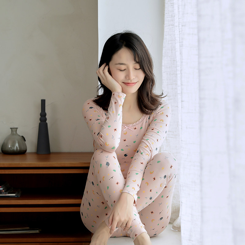 Pure cotton girl autumn clothes and autumn trousers autumn and winter thin section long-sleeved inner wearing bottoming shirt two-piece set printed thermal underwear spring