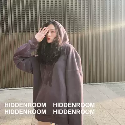 (H)WE11 GOODS king DONE autumn AND winter zipper bear reflective printing plus velvet faded fabric hooded sweatshirt